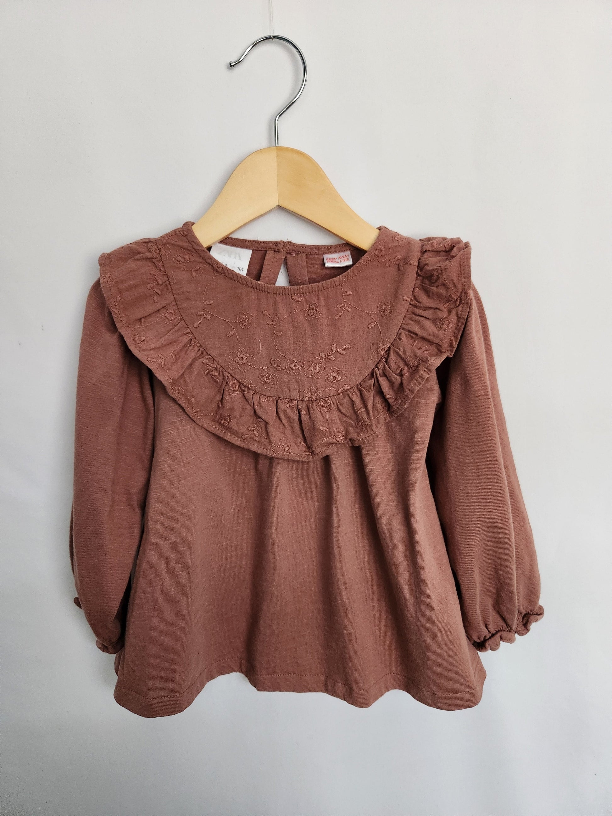 Zara Rose Brown Floral Neckline Long Sleeve Shirt • 3-4 years